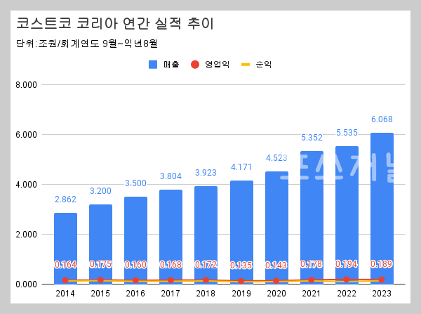 코로나19는 소비 패턴에 많은 변화를 불러왔습니다. 사회적 거리두기와 이동 제한 조치로 인해 사람들이 외부 활동을 자제하면서, 대량 구매와 가정에서의 온라인 소비가 급증했습니다. 이러한 상황에서 코스트코의 대량 구매와 창고형 할인이라는 비즈니스 모델은 오히려 소비자들에게 큰 호응을 얻었던 것으로 생각됩니다. 하단의 자료는 코스트코 코리아의 연간 매출 실적 추이입니다. 2020년 4.5조, 2021년 5.3조로 증가했으며, 2022년 5.5조, 2023년 6조 수준으로 코로나19 시기에도 매출 성장을 보였으며, 엔데믹 이후에도 성장세가 유지되고 있습니다.