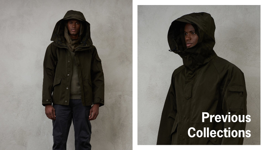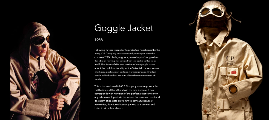 고글 후드 자켓(Goggle Jacket)은 후드에 고글이 부착된 형태로, CP컴퍼니를 상징하는 시그니처 디자인입니다. 원래는 모터사이클을 타는 사람들을 위해 고안된 디자인이지만, 이제는 CP컴퍼니만의 독창성을 상징하는 아이템이 되었습니다. CP컴퍼니는 가먼트 다잉(garment dyeing)이라는 완성된 옷에 염색을 하는 기법으로 패션 업계에서 최초로 도입한 사례입니다. 이렇게 가먼트 다잉을 하게 되면, 염색시 만들어지는 자연스러운 구김, 봉제 부분 수축으로 인한 퍼커링(물결무늬) 효과 등을 만들어 내어 빈티지한 감성을 만들어 내게 되는데요. 그래서 CP컴퍼니만의 다른 감성을 만들어내고 있다고 할 수 있겠네요. 실용성과 스타일을 겸비한 밀리터리 스타일을 현대적 감각으로 재해석하면서도 기능성을 보여주는 스타일로 수많은 매니아층을 가지고 있는 브랜드이기도 합니다.