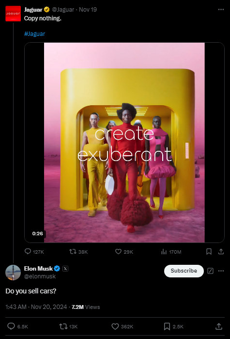 재규어 리브랜딩 캠페인에 대한 논란을 촉발하게 된 것은 아무래도 일론 머스크의 트위터(X)에서 시작되지 않았을까 싶습니다. Do you sell cars?라는 짧은 반응으로 주목을 받으며, 이후 패러디 영상까지 등장하며, 논란이 더욱 확대되는 분위기이긴 합니다. 영국의 헤리티지를 가진 재규어를 생각하고, 지금까지 기대해왔던 소비자들에게 이번 캠페인은 기존의 재규어가 가진 브랜드와는 전혀 다른 접근으로 인해서 소비자들이 받아들이기에 어려움이 있었을 것으로 짐작이 되긴 합니다. 다만, 기존의 헤리티지를 가진 재규어와 완전히 새롭게 변화한다는 이미지와 이에 따른 홍보 목적에서는 나름의 성과를 얻지 않을까 생각도 되네요. 지금은 논란일 수 있지만, 앞으로 어떻게 자동차를 선보이느냐에 따라 논란이 호감으로 바뀔 가능성도 있을 것입니다.