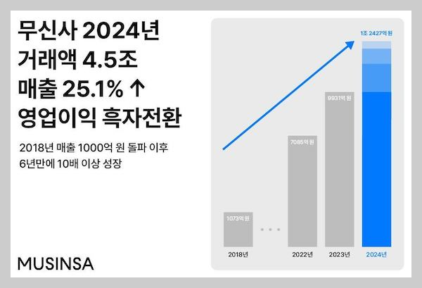 무신사의 연매출은 2024년 기준 1조 2,427억 원을 돌파습니다. 이는 전년 대비 25.1% 성장한 수치이며, 영업이익은 1,028억 원으로 전년도 적자에서 흑자로 전환을 이루어낸 성과입니다. 2018년 매출 1000억을 돌파한 이후, 6년만에 10배 이상의 성장을 이루었는데요. 그렇다면 무신사는 어떤 무신사다움으로 성장했는지 몇가지 포인트를 살펴보겠습니다.