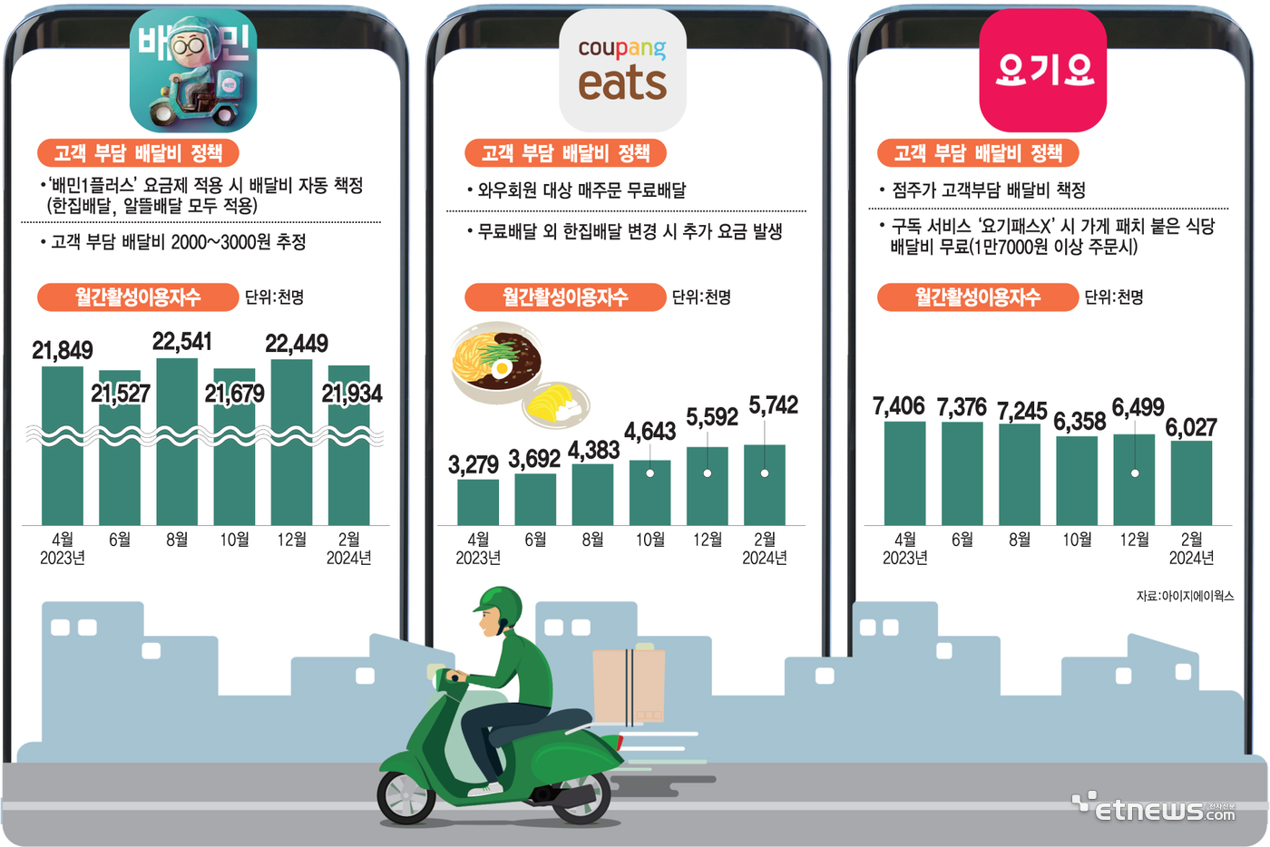 배달의민족은 월간 활성 이용자 수(MAU)기준으로 무려 2,243만명이 이용하는 슈퍼앱 중 하나입니다. 24년 기준으로 매출은 4조 3,226억원, 영업이익은 6,408억으로 조사가 됩니다. 구독제 서비스 배민클럽을 유료화한 이후 시장 점유율에서는 59.6%로 22년 이후 61~62%를 유지하던 수준에서는 다소 떨어졌지만, 배달앱에서는 단연 1위를 지키고 있는 상황입니다. 한편 쿠팡이츠는 24년 12월 기준으로 월간 활성 이용자 수(MAU) 963만명으로 배달의민족을 맹추격하고 있기도 합니다. 쿠팡이츠는 시장점유율이 26%로 성장하면서, 곧 1000만명 월간 활성 이용자를 달성할 것으로 예상되고 있습니다.