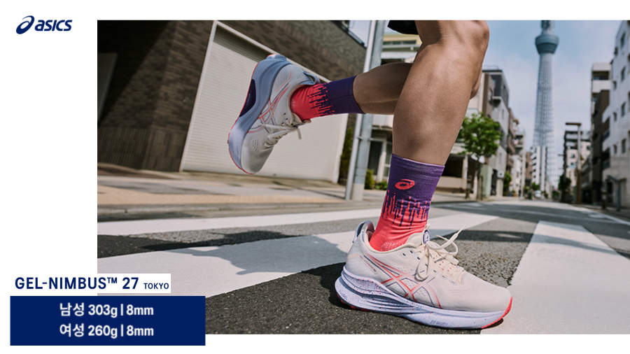 첫 번째는 아식스 젤 님버스 27(Gel Nimbus 27)으로, 오랫동안 맥시멀 쿠션의 대명사로 불리며 장거리 초보 러너에게 안정적이고 부드러운 착화감을 제공하는 평가받고 있습니다. 아식스 다른 모델에 비해 가장 높은 쿠션감을 가진 모델로 부드럽고 편안한 러닝에 좋은 제품이라고 하겠네요.