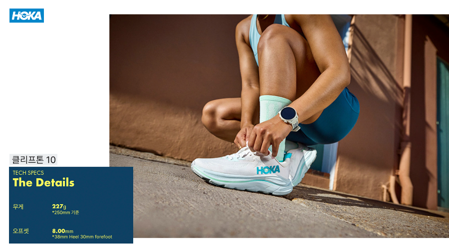 두 번째는 요즘 인기를 많이 모으고 있는 호카 브랜드는 발이 편안하다는 소문이 나면서 인기를 모으고 있는데요. 호카 여러 모델 중 클리프톤 10(Clifton 10)은 두툼한 미드솔 덕분에 피로를 줄여주면서도 가볍게 달릴 수 있어 입문자에게 적합한 모델입니다. 좀 더 높은 쿠션감을 원한다면, 본디9(Bondi 9)도 있습니다. 그리고 두 제품은 일상에서도 워킹 등 폭넓은 용도로 적합한 모델이기도 합니다.