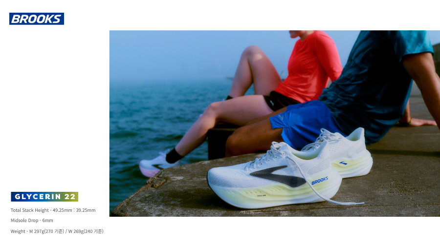 그리고 네 번째는 브룩스는 국내에서 많이 알려진 브랜드는 아닙니다. 1914년 설립된 미국 러닝 전문 브랜드로 벌써 100년이 넘는 역사를 가진 브랜드이기도 합니다. 돌아와서, 러닝화 모델 중 쿠션감이 높고 편한 러닝화로 꼽을 수 있는 모델은 글리세린 22(Glycerin 22), 글리세린 MAX입니다. 부드러운 미드솔 소재를 활용해 발을 편안하게 감싸주며 회복용 러닝이나 일상 조깅에도 좋은 제품으로 평가를 받고 있습니다.