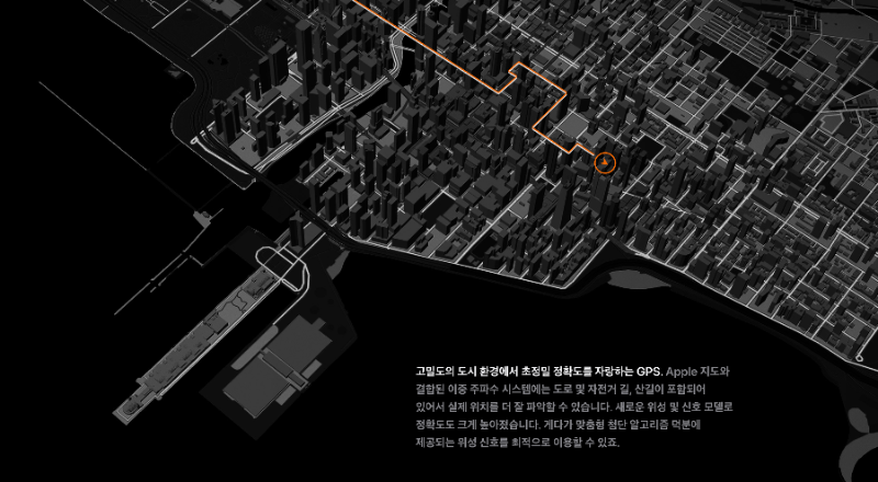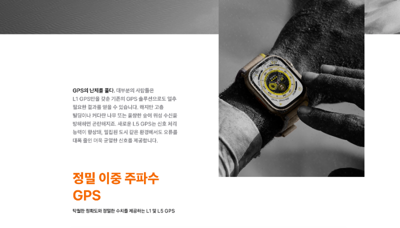 이번에 출시한 애플워치 울트라에는 이중 주파수(L1,L5) GPS를 사용합니다. 기존에 L1채널(주파수)를 사용하는 GPS는 실제 오차 범위가 5~15m입니다. 대부분의 스마트 디바이스에는 L1 GPS를 사용하는데요. 이러한 오차범위를 보정하기 위해 내비게이션의 경우는 실제 지도 데이터와 결합해서 보정하는 과정을 거치게 됩니다. 내가 있는 위치를 GPS에서 얻게 되면, 지도 데이터와 결합해서 방향성, 차량 도로 위치 등을 결합해서 보정과정을 거치게 된다고 합니다. 이번에 울트라에 들어간 L5 GPS은 오차범위를 30cm까지 줄여준다고 알려져 있습니다. 애플에서 발표한 것처럼 밀도가 높은 도시환경에서도 정확한 위치정보를 활용할 수 있어서 앞으로 애플워치 울트라에 GPS를 활용한 다양한 앱들이 출시될 수 있을 것으로 기대가 됩니다. 또한 위급한 상황에서도 사용자의 위치 정보를 보다 정확하게 파악할 수 있기 때문에 응급 조치도 빠르게 진행될 수 있을 것으로 생각되네요. 향후 이중 주파수를 활용하는 GPS 보급이 확대된다면, 위치정보를 결합 디바이스, 앱들이 더욱 발전을 할 수 있을 것입니다.
