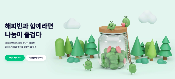 네이버의 사회공헌 활동 중 가장 네이버스럽게 하고 있는 것이 해피빈(happybean)입니다. 온라인 기부 포털 사이트를 구축해서, 일상에 쉽고 기분 좋게 기부라는 문화를 다양한 방식으로 확산시켜가고 있는 모델이 아닐까 생각됩니다. 해피빈은 네이버 산하의 비영리 기관입니다. 2005년 7월에 아름다운재단과 네이버가 함께 시작한 최초의 온라인 기부 포털사이트로, 2009년에 네이버가 자본금 30억을 마련해 비영리 재단법인으로 해피빈을 담당하게 되었다고 알려져 있습니다. 2022년 12월 1일 기준으로 누적 기부금액은 1,816억원을 넘어서며, 누적 참여자는 1,183만명을 넘어서고 있습니다. 네이버가 기부하는 것뿐만 아니라, 사용자, 그리고 기부단체, 기업들이 함께 참여하여 만들어가고 있는 기부 플랫폼이라는 점에서 함께 만들어간다는 가치와 의미를 잘 구현한 사이트라고 생각됩니다.