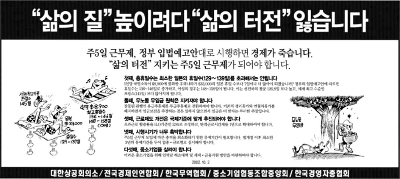 지금은 주5일제가 일반적으로 자리를 잡았지만, 주5일제를 시행하기까지는 참으로 많은 논란이 있었습니다. 잠깐 그 시작을 살펴보면, 법정 노동시간은 1953년 근로기준법을 기준으로 당시 1일 8시간으로 주6일제(주48시간)이었습니다. 그리고 그때만 해 주6일 근무에도 초과근무가 늘상이었던 시절이기도 했습니다. 장시간 근로로 인해 노동자의 건강과 안전에 대한 우려가 제기되면서, 1989년 정부는 주44시간으로 법정 노동시간을 단축하였습니다. 그렇게 해서 토요일 오전근무까지 하는 것이 주44시간 법정 노동시간이 자리를 잡게 되었습니다.