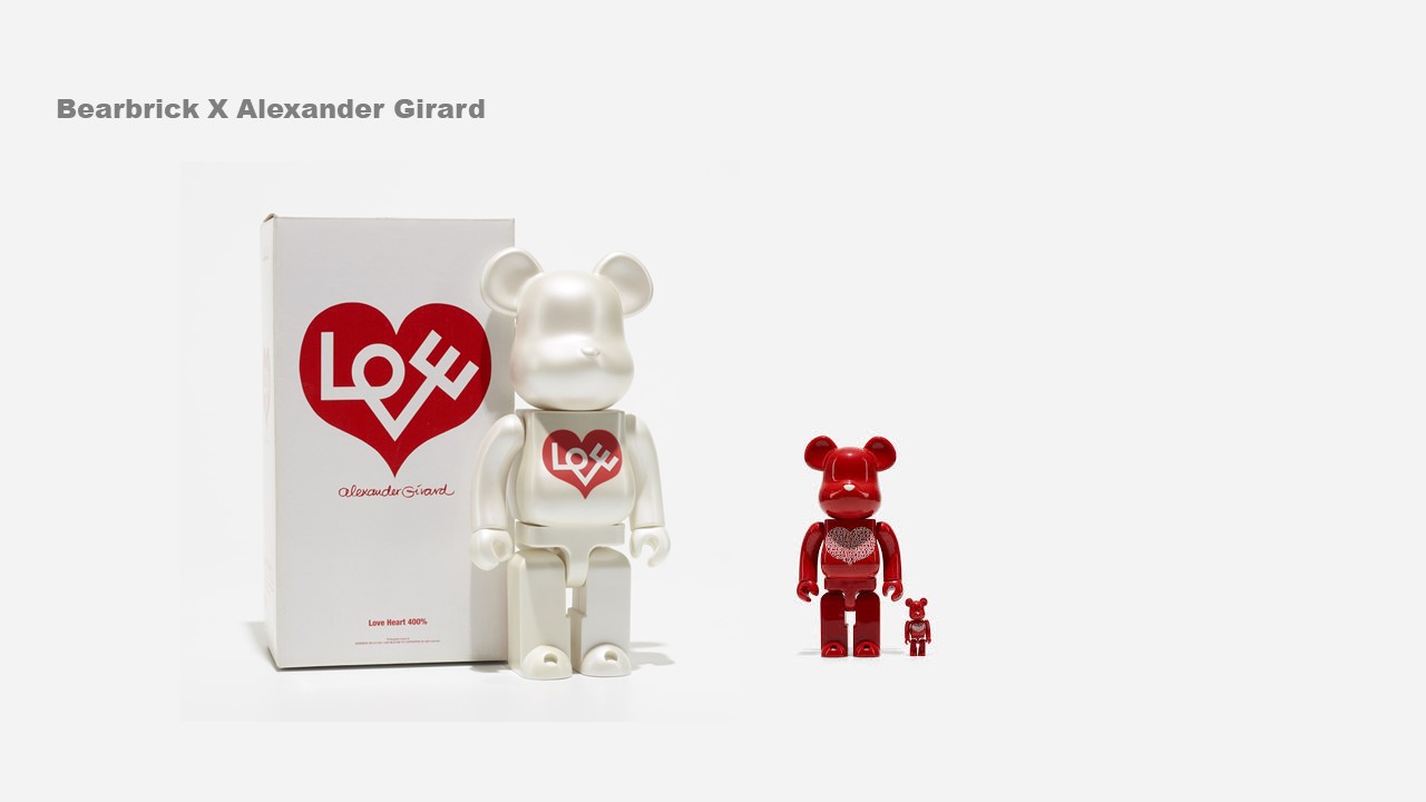 알렉산더 지라드(Alexander Girard) 역시도 베이브릭과 콜라보를 진행했습니다. 모더니즘 디자인을 대표하는 아티스트인 알렉산더 지라드의 기하학적 추상 패턴이 들어간 베어브릭도 역시 많은 화제가 되었습니다. 알렉산더 지라드의 대표적인 시그니처인 러브 하트가 베어브릭을 매력적으로 만들기도 하는 것 같습니다.