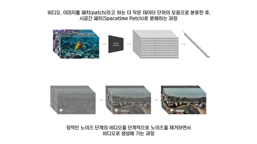 쉽게 생각하면, 바다속에 나비라고 하면 나비라는 객체, 나비에 대한 시퀀스, 바다라는 시공간에 대한 작은 데이터로 분해하고 추출하고 이를 통해 정적인 노이즈 단계의 비디오를 단계적으로 노이즈를 제거하면서 비디오로 생성해 가는 과정을 거친다고 보면 될 것 같습니다. 기존의 챗GPT가 단어, 문장, 문자 데이터를 분해하고 추출해 가는 과정을 이미지, 동영상을 분해하고 추출함과 동시 학습과정을 통해 단계적으로 동영상을 생성해 가는 과정이라고 보면 될 것 같네요.